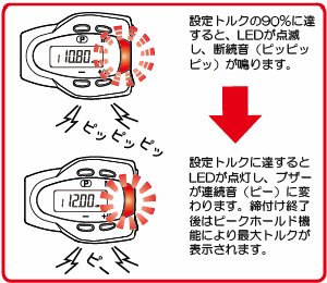 - 締付けトルク値を液晶表示で確認、設定トルクをLEDとブザーでお知らせし、締め過ぎ防止。