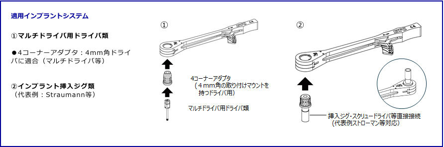 ② 4コーナーアダプタに選定したドライバやツール類を装着する。